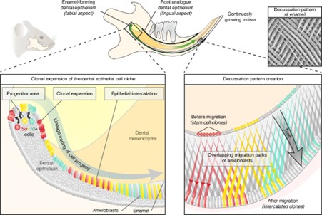 Within dental epithelium these cells were found exclusively in the enamel-producing, labial aspect, of the tooth. By tracking these cells in the continuously growing mouse incisors, the researchers discovered that over time, they clonally give rise to ameloblasts and help to orchestrate the complex cellular movements and organization of ameloblasts.